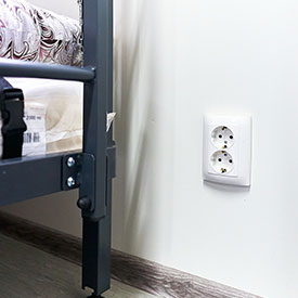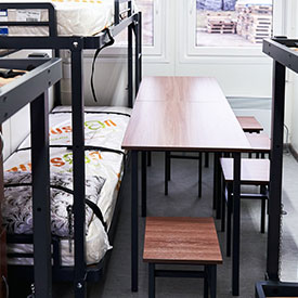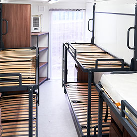 Модуль обладнано сучасними та енергоефективними системами опалення та кондиціювання. Сучасні вікна обладнано вбудованими ролетами та москітними сітками. Відсутність на стінах кабелів та електричної проводки разом з приємним на дотик та вандалостійким металевим покриттям стін є зручною та безпечною альтернативою іншим матеріалам. Підлога має протиковзний шар з ПВХ матеріалу. Зручні двоповерхові ліжка з дерев’яними ламелями підвищеної міцності легко складаються до стін, вивільняючи додатковий простір у приміщенні. Якісні меблі можуть бути виготовлені індивідуально згідно з побажанням замовника.