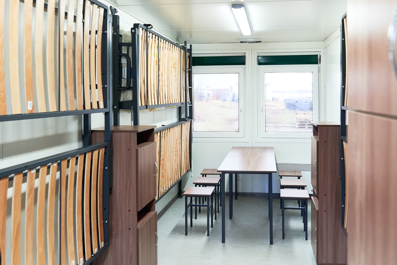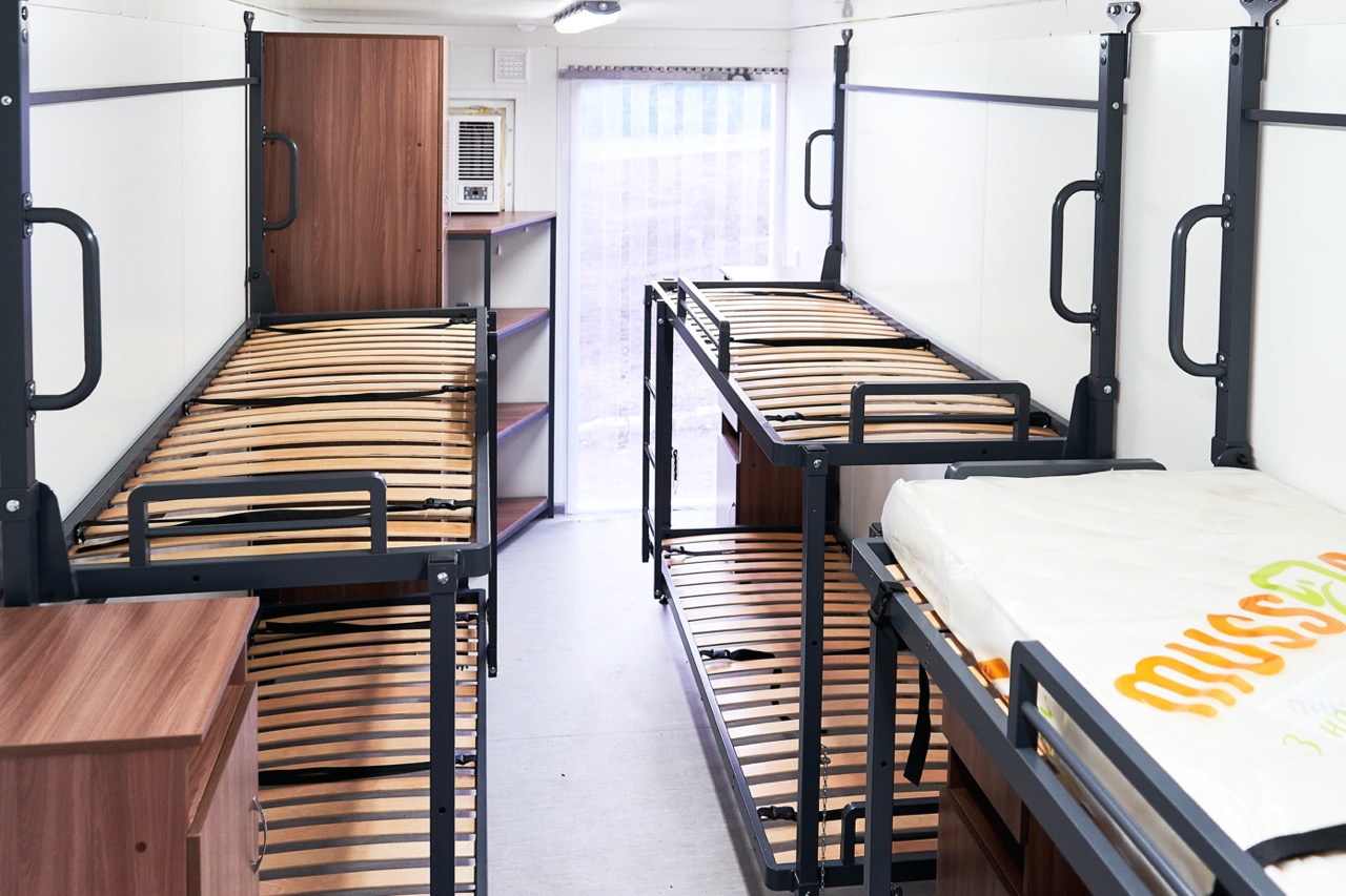 Модуль обладнано сучасними та енергоефективними системами опалення та кондиціювання. Сучасні вікна обладнано вбудованими ролетами та москітними сітками. Відсутність на стінах кабелів та електричної проводки разом з приємним на дотик та вандалостійким металевим покриттям стін є зручною та безпечною альтернативою іншим матеріалам. Підлога має протиковзний шар з ПВХ матеріалу. Зручні двоповерхові ліжка з дерев’яними ламелями підвищеної міцності легко складаються до стін, вивільняючи додатковий простір у приміщенні. Якісні меблі можуть бути виготовлені індивідуально згідно з побажанням замовника.